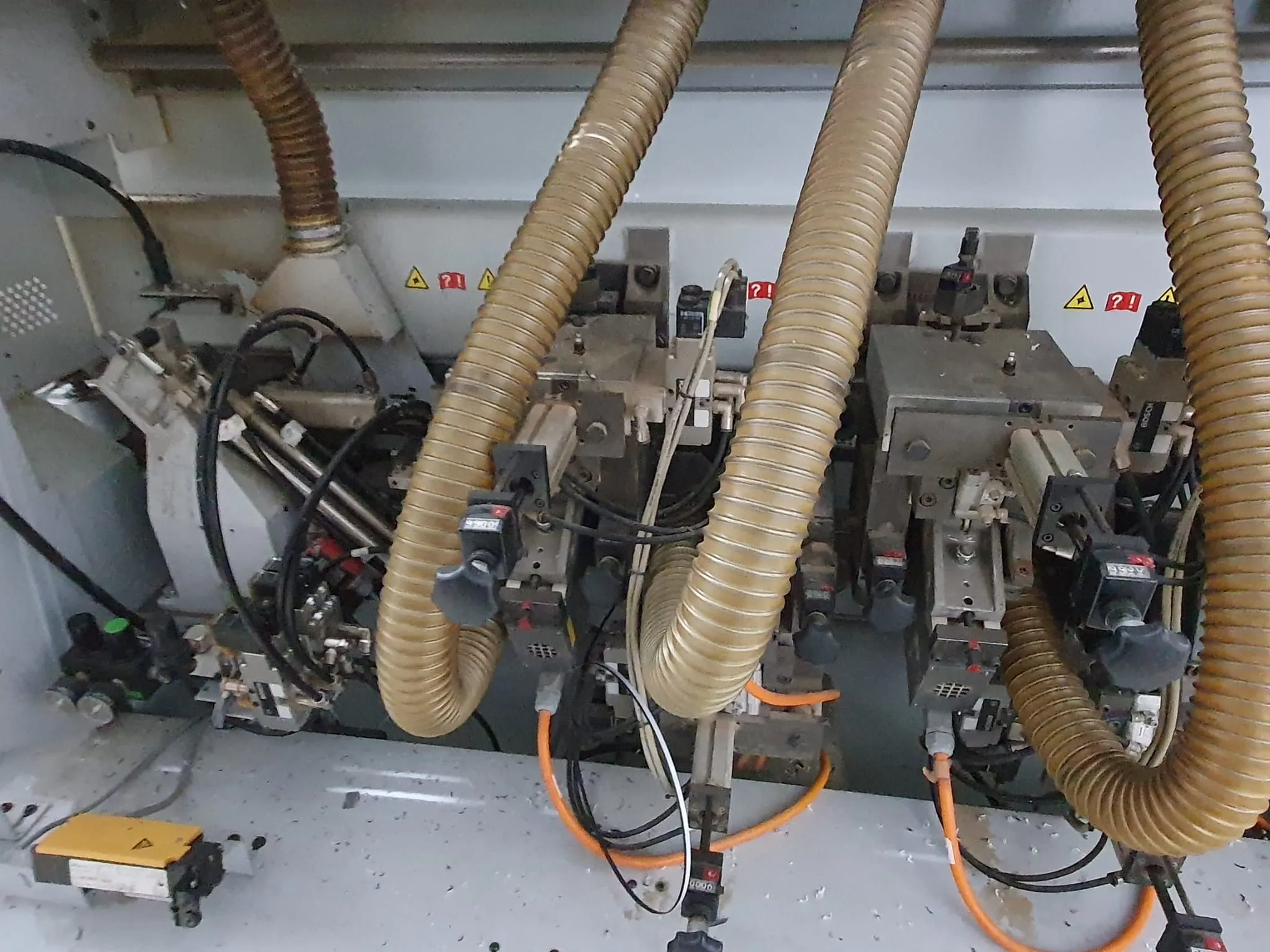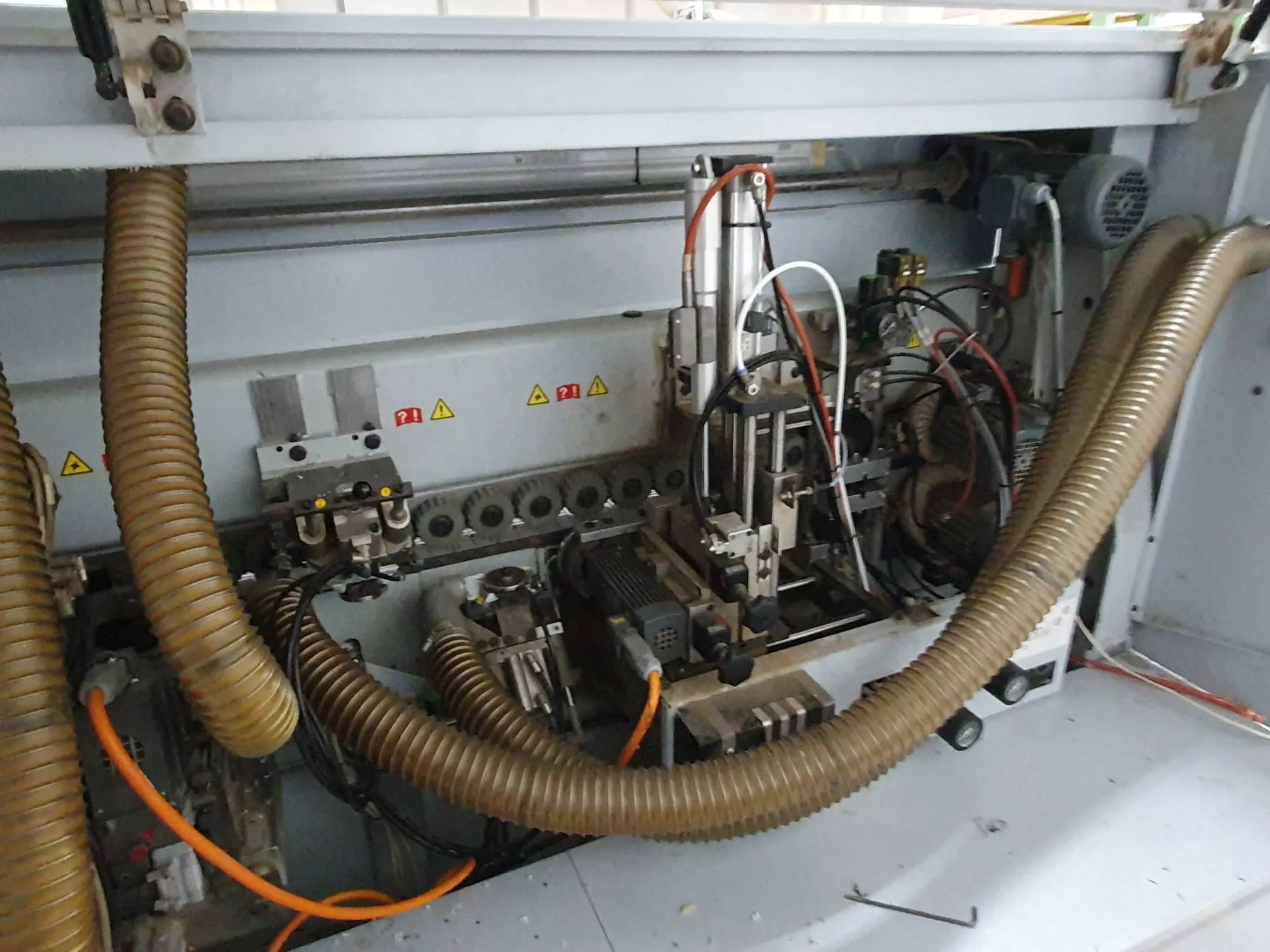 Gebrauchtmaschine, Vorfräsen/Fügen, hat zwei Kantenfräsen R1 und R2 drauf, Eckenkopieren, Wechselköpfe für Ziehklinge, Nesting Tastung oben/ unten.