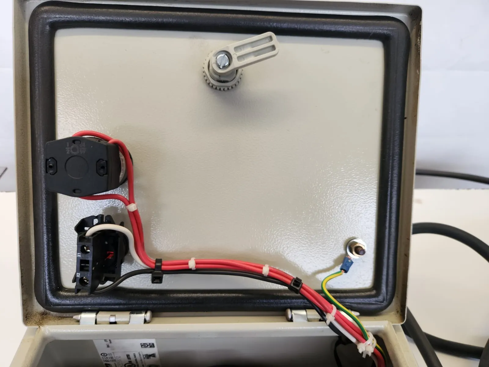 Der Schaltschrank ist mit Kabeln ausgestattet, der Innenaufbau ist auf den Bildern vollständig zu sehen.