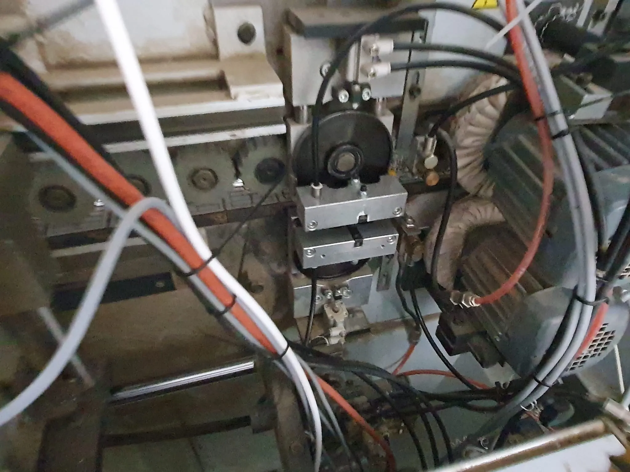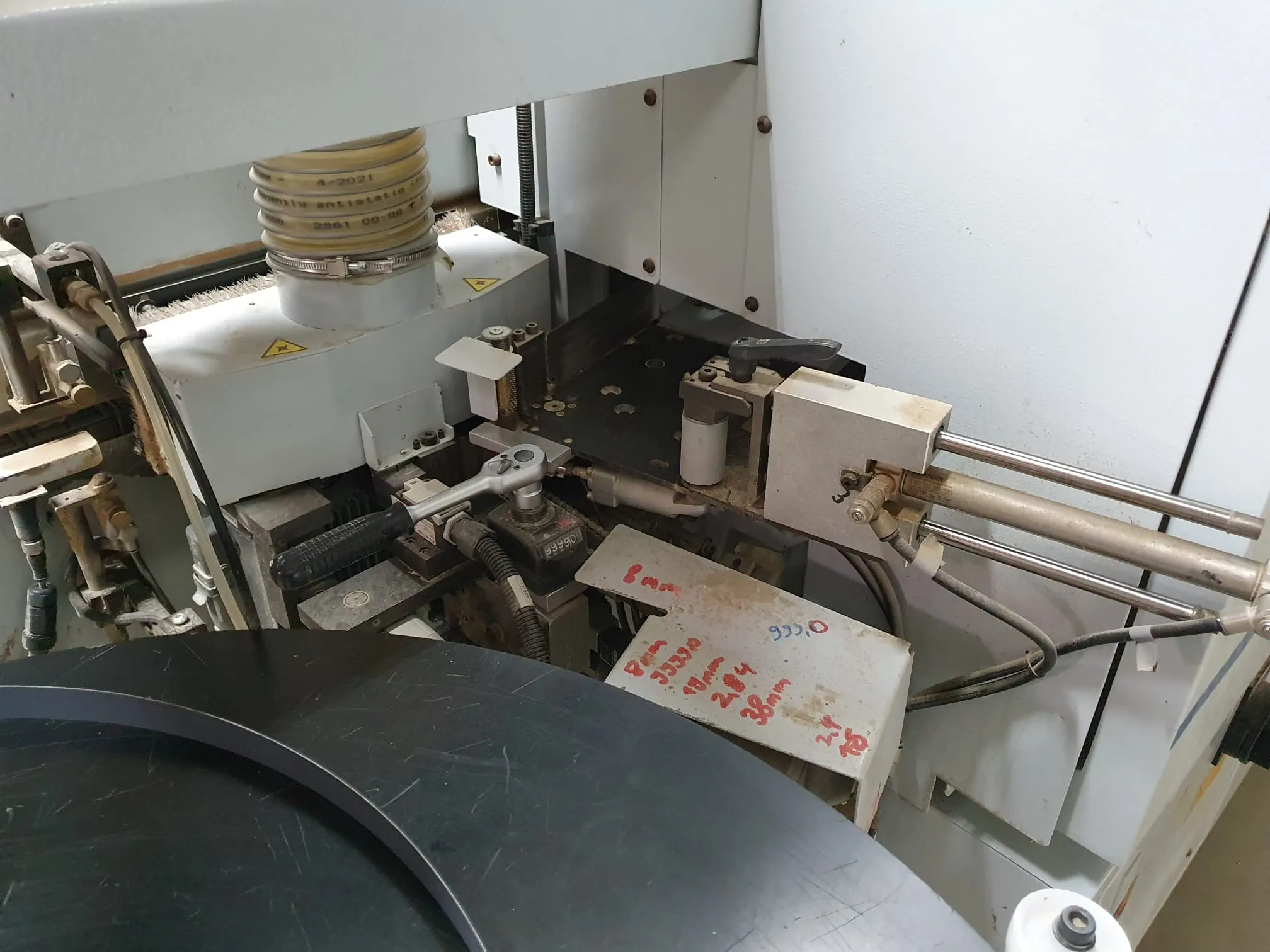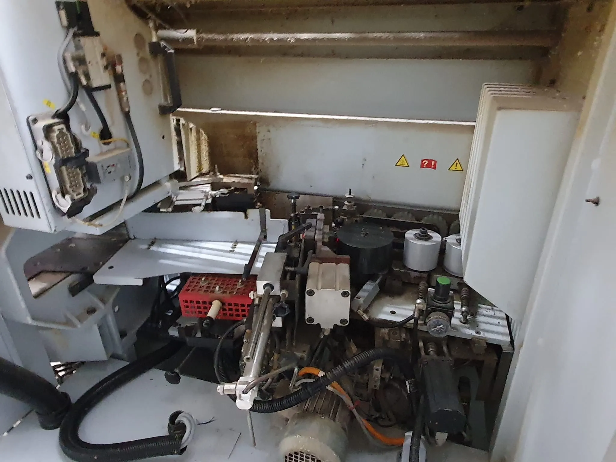 Gebrauchtmaschine, Vorfräsen/Fügen, hat zwei Kantenfräsen R1 und R2 drauf, Eckenkopieren, Wechselköpfe für Ziehklinge, Nesting Tastung oben/ unten.