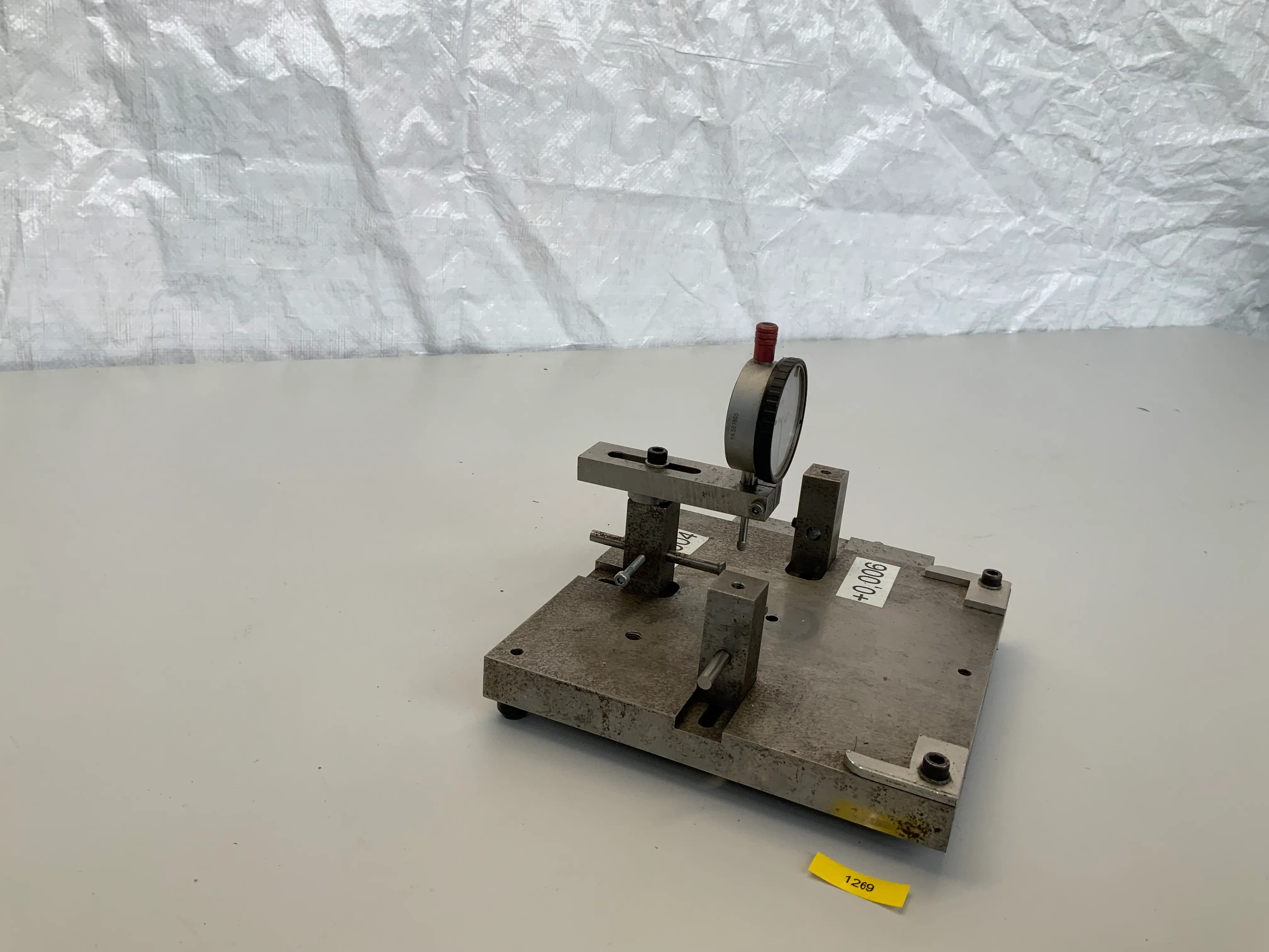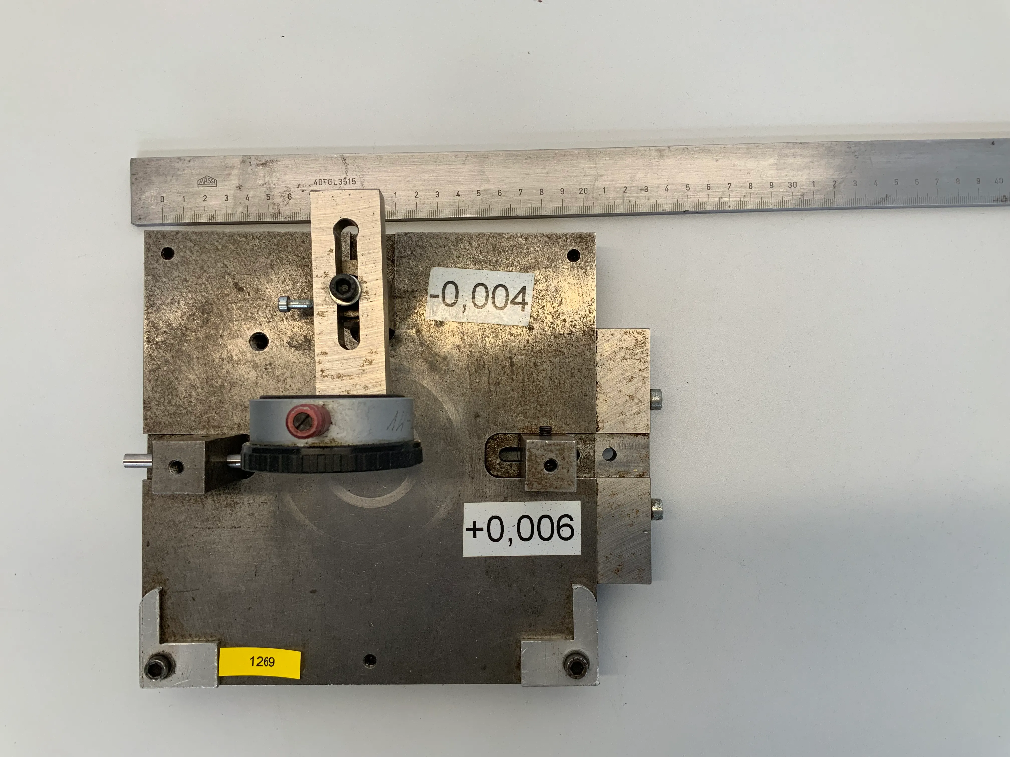 Ich biete eine Prüfvorrichtung mit einer Feinmessuhr der Marke Käfer an (Ablesung 0,01 mm). Die Vorrichtung verfügt über justierbare Anschläge und Halterungen sowie Messbereiche mit Toleranzangaben von -0,004 mm bis +0,006 mm.