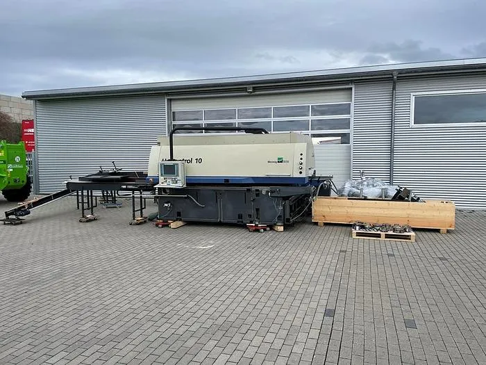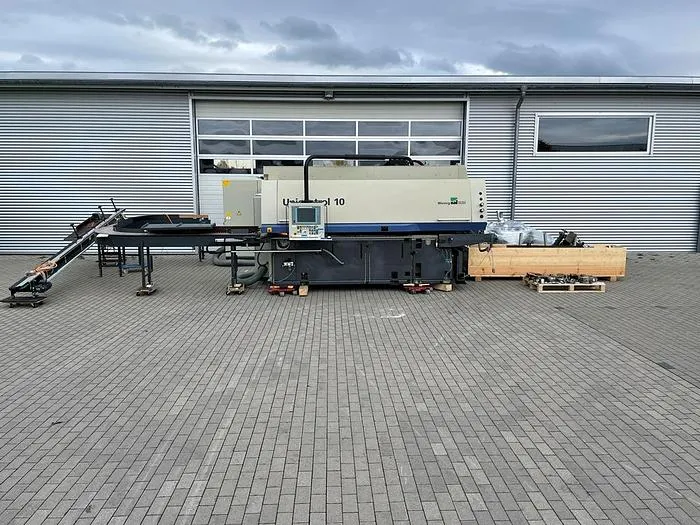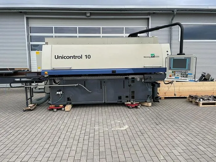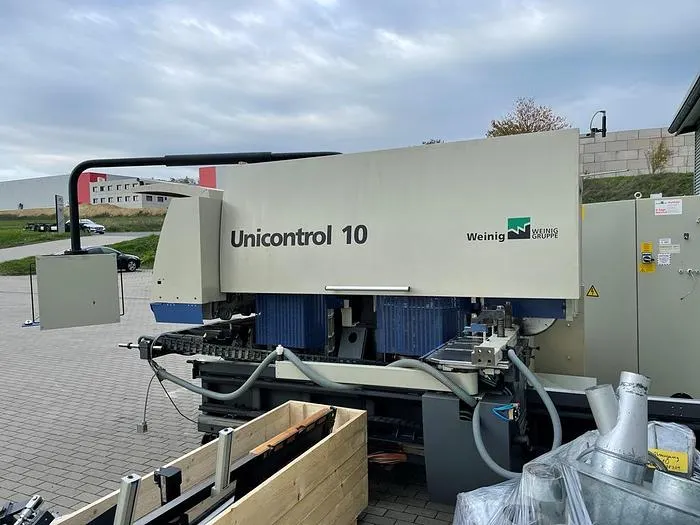 Winkelanlage Weinig Unicontrol 10 (UC 10) zur Herstellung von Fenstern, Elementen und Türen. Rahmenweise, serienweise oder Einzelteilefertigung mit 2 Zapf- und Schlitzspindeln inkl. Werkzeugsatz Oertli Aggregate: 1.     Ablängsäge, NC-Achse, 3 kW, ø 40 mm, 2.800 UpM2.     Erste Zapf- und Schlitzspindel, NC-Achse, ø 50 mm, 15 kW,Spannlänge: 640 mm (8 x 80) mm3.     Zweite Zapf- und Schlitzspindel, NC-Achse, ø 50 mm , 11 kW, Spannlänge: 400 mm4.     Profilierspindel 1, NC-Achse, ø 50 mm , 11 kW, Spannlänge: 4 x 80 mm5.     Profilfräsaggregat, horizontal von oben, 3 kW6.     Profilierspindel 2, NC-Achse, ø 50 mm , 11 kW, Spannlänge: 4 x 80 mm7.     Profilierspindel 3, NC-Achse, ø 50 mm , 11 kW, Spannlänge: 400 mm8.     Profilfräsaggregat, vertikal rechts, 3 kW9.     Profilfräsaggregat, vertikal rechts von oben, 3 kW10.  Profilfräsaggregat, horizontal von unten, NC-Achse 3 kW DoppelteilepaketUmfräspaket mit UmfräswagenAutomatisches WendesystemPC-Steuerung NEXUSCNC gesteuerter LängenanschlagStudiofenster EinrichtungAggregat für Kantenrundung von unten mit AblängsägeSprossenstützleisteInkl. Absaugrohr SystemInkl. Werkzeugsatz OertliWeitere technische Daten und Werkzeugzeichnungen auf Anfrage.