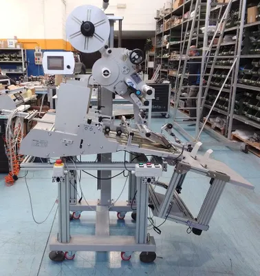 System zum Vereinzeln und Etikettieren von Kartons und Beuteln. Der Encoder synchronisiert Ablösegeschwindigkeit und Ausgabegeschwindigkeit und sorgt für hohe Genauigkeit beim Etikettenauftrag.