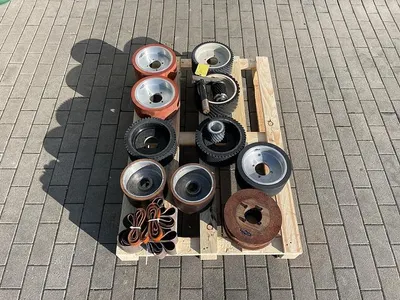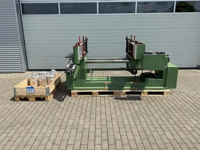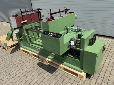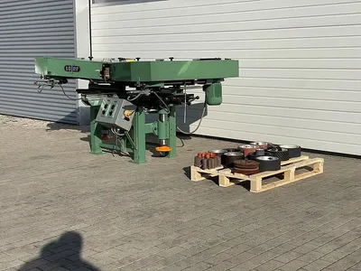 Doppelseitige (oben / unten) Schleifmaschine Stähle Hess Saturn Roto Finish zum Feinschleifen von Fensterkanteln oder anderen Hölzern. Zwei Aggregaten mit jeweils mehreren planschleifenden, rotierenden Werkzeugen, die sich zusätzlich mit dem Schleifaggregat um die eigene Achse drehen und so ein Kappen der Holzfasern erreichen mit einfacher Einstellung der Holzart. Anwendung z.B. als Schleifmaschine nach Hobelmaschine in einer Fensterfertigung.